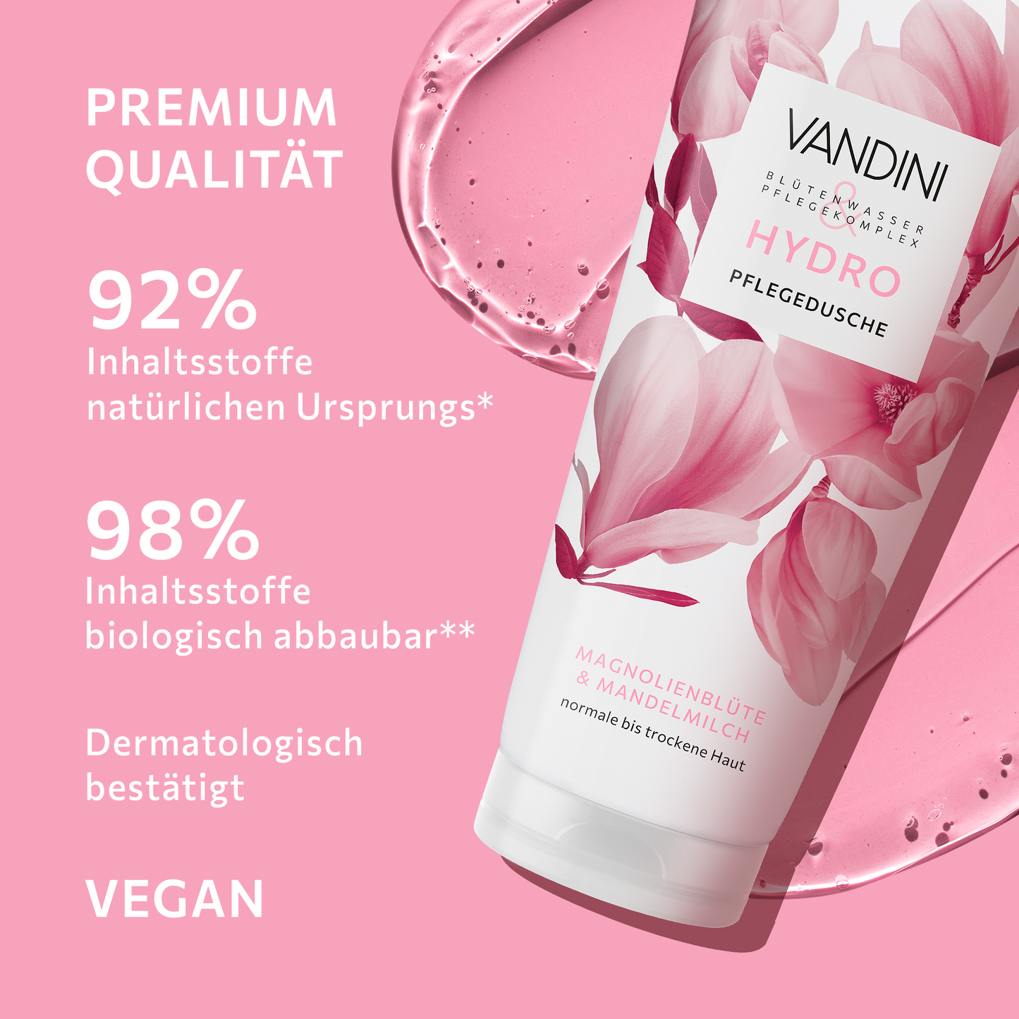 Experience how the delicate scent of magnolia blossom caresses your senses. VANDINI's HYDRO Shower Gel combines natural ingredients into a unique HYDRO care complex for normal to dry skin. This gentle shower gel pampers not only the skin but also the senses.