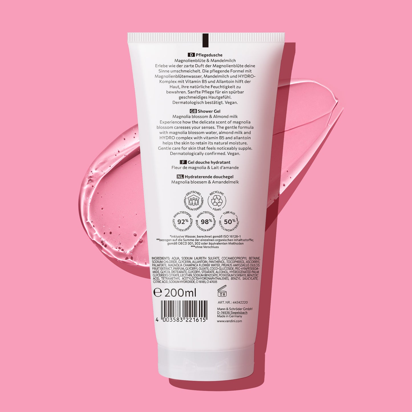 The unique formula of VANDINI Shower Gel with magnolia blossom water and almond milk is a must-have for normal to dry skin. The HYDRO complex with vitamin B5 and allantoin helps the skin retain its natural moisture and leaves it feeling soft and smooth. These nourishing ingredients turn the shower experience into a special ritual!